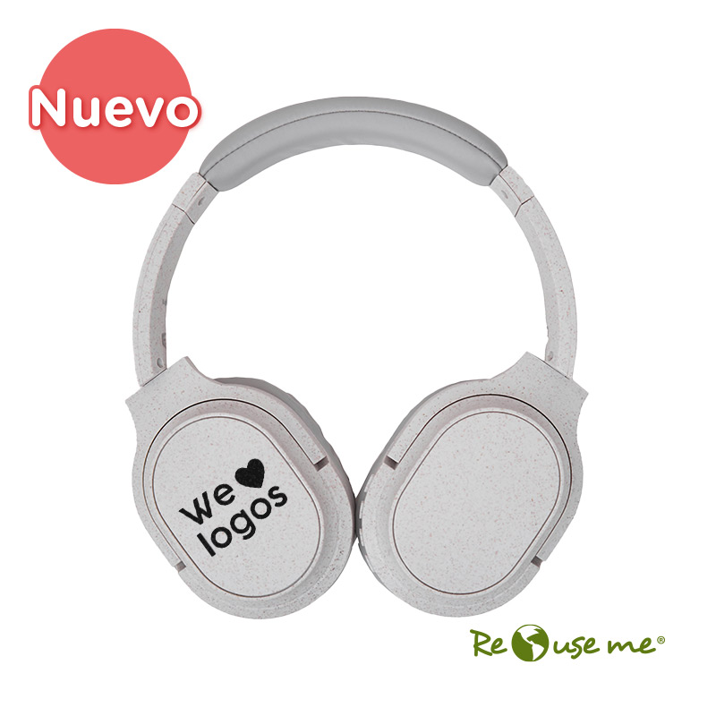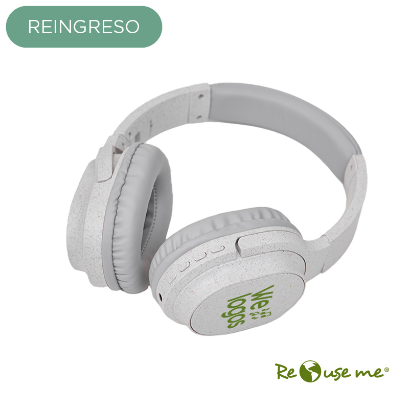 Auriculares inalámbricos estilo diadema, con micrófono incorporado. Realizado en ABS y Wheat Straw, pasta de tallo de trigo, un material sustentable que reduce el consumo de plásticos vírgenes. Cuenta con cobertura bluetooth en una distancia de 10 metros y conector para cable jack de 3.5mm, y ranura para tarjetas de memoria. Incluye cable micro USB de carga. Incluye botones de comando para encender, apagar, retroceder y avanzar. Su capacidad de carga es de 450mAh. Medidas: 195 x 165 x 75 mm. Tiene una potencia de 15mWx2 y una sensibilidad de 85dB. Impedancia: 32 Ω. Bluetooth: 5.1. Debido a que la pasta de trigo es un material sustentable y 100% natural, puede haber ligeras variaciones en el color del producto de un lote a otro. ReUseMe.
