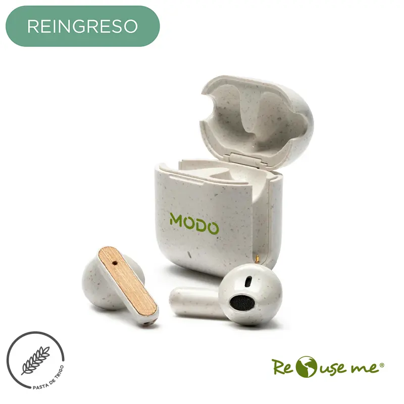 Auriculares inalámbricos fabricados en bambú, ABS y Wheat Straw, pasta de tallo de trigo, un material sustentable que reduce el consumo de plásticos vírgenes. Cada auricular cuenta con un botón touch que permite: contestar y finalizar llamadas, reproducir y pausar música, cambiar a la siguiente o anterior canción, subir y bajar el volumen y acceder al asistente de voz. Tienen tecnología Bluetooth 5.3, una duración de batería de aproximadamente 3.5 horas y un estuche de carga de 200 mAh, el cual se carga a través de un cable usb c. Los auriculares vienen dentro de una caja de cartón junto a su manual de instrucciones y cable cargador. Debido a que la pasta de trigo es un material sustentable y 100% natural, puede haber ligeras variaciones en el color del producto de un lote a otro. ReUseMe