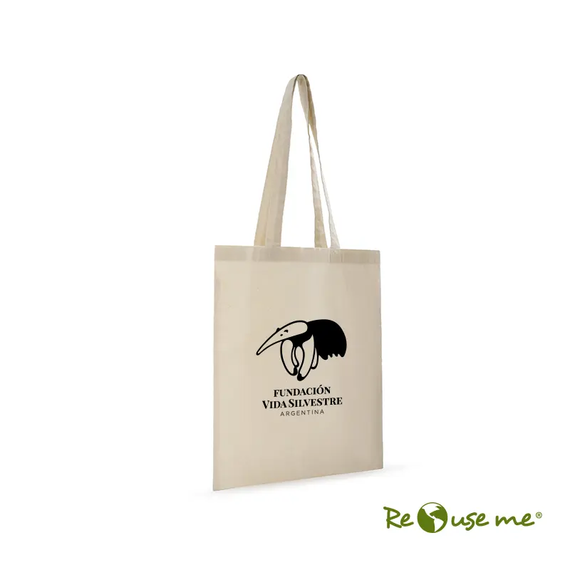 Tote bag fabricada en algodón recilcado de 140gsm, en color natural. Ideal para quienes necesitan una bolsa amplia y ligera para el uso diario, perfecta para llevar compras, libros o artículos personales con comodidad. ReUseMe