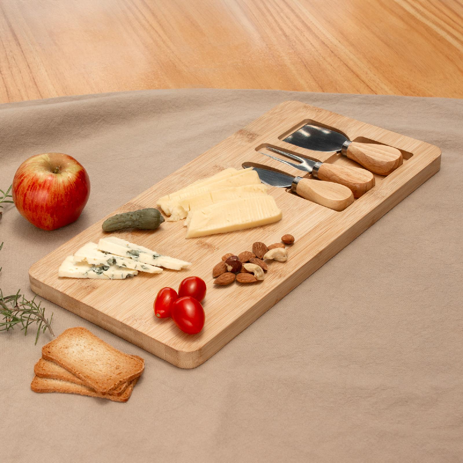 Regala funcionalidad y estilo.Tabla de bambú con set de 3 utensilios de acero inoxidable 420 con mango de madera de caucho: 1 cuchillo, 1 tenedor y 1 espátula. Medidas: 38 x 18,4 x 1,7 cm. Materiales: Bambú y acero inoxidable. Presentación: en caja de regalo kraft.