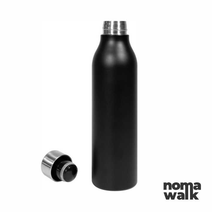 Ø 6,6 x 24,5 cm. Capacidad 500 ml. Acero inoxidable. Botella doble pared, sellada al vacío con recubrimiento de cobre. Interior de acero 304 y exterior de acero 201. Pintura color negro mate. Tapa de acero a rosca. Mantiene por más de 12 hs la temperatura de las bebidas calientes y 24 hs de las bebidas frías. Presentación en caja de regalo.