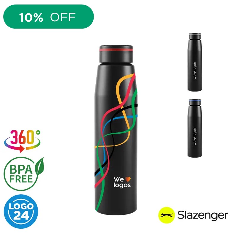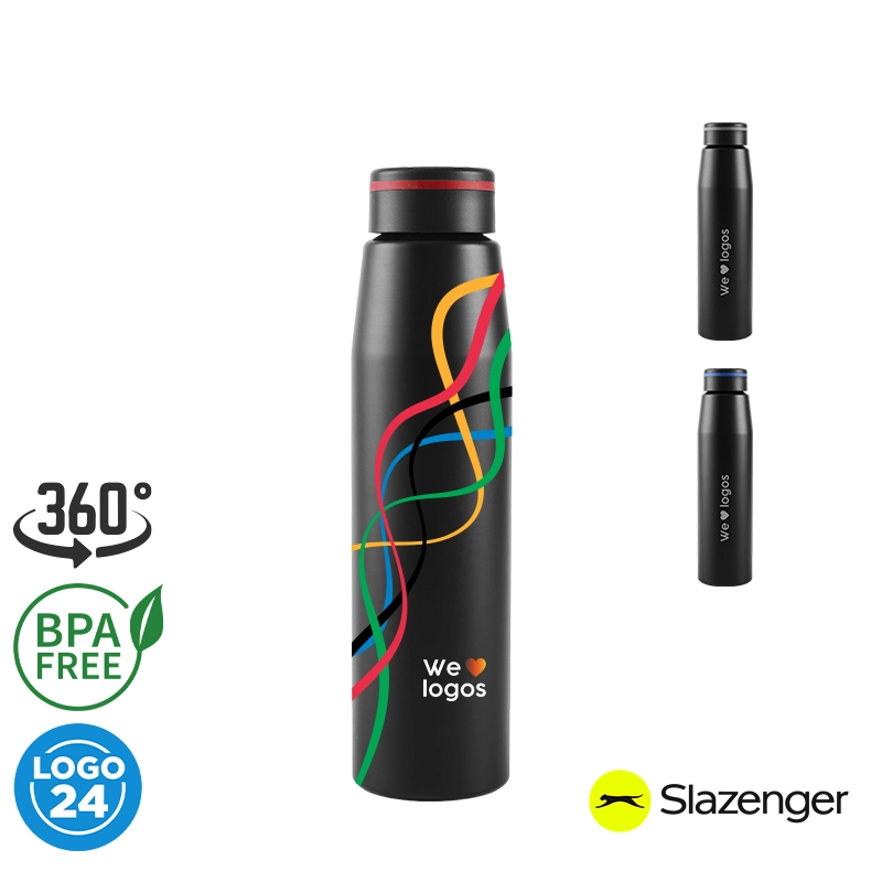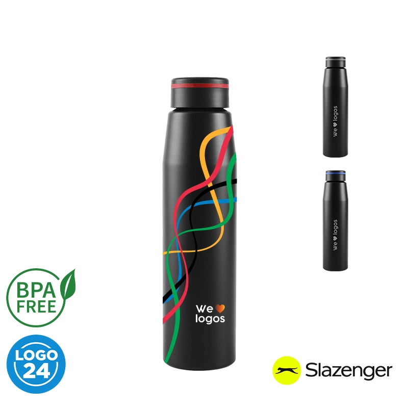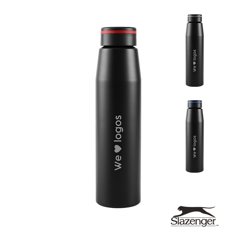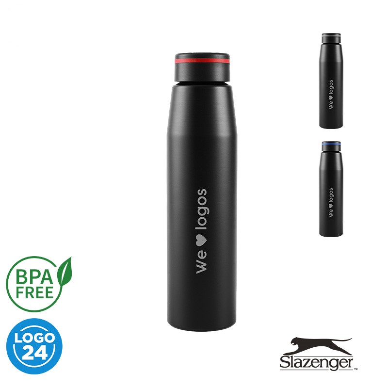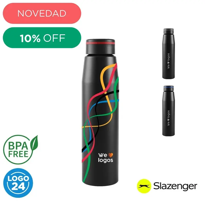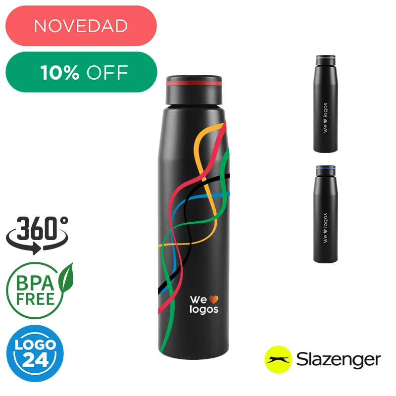 Botella de 700 ml fabricada en aluminio con tapa negra a rosca con banda de silicona de color gris, roja o azul. Ideal para tus actividades deportivas y al aire libre. Con impacto positivo en el medio ambiente, esta botella reutilizable te ayuda a reducir el consumo de plástico de un solo uso. Producto libre de BPA y aprobado por el I.N.A.L. para el contacto con alimentos. Presentado en GiftBox. Apta solo para bebidas frías. No es apto para lavavajillas. No es apto para microondas. Slazenger.
