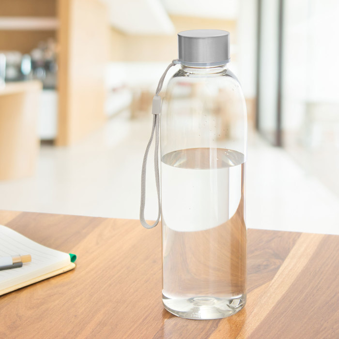 Ø 7 x 23 cm. Capacidad 700 ml. Peso de la botella 70 g y de la tapa 15g. Material PET Cristalino. Botella de plástico transparente con tapa a rosca de acero inoxidable, anillo de silicona antiderrame y correa para transportar. ATENCIÓN Botella y tapa se entregan por separado. / No utilizar con bebidas gaseosas ni líquidos calientes. / El manejo de este producto es delicado. / No exponer al sol y temperaturas altas por tiempo prolongado.