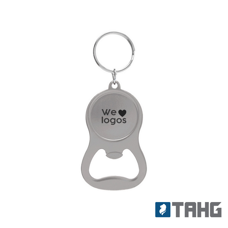 Llavero abridor tapa corona, metálico. Medidas: 4 x 6,5 x 0,3 cm. (anillo de 25 mm de diámetro). Tahg