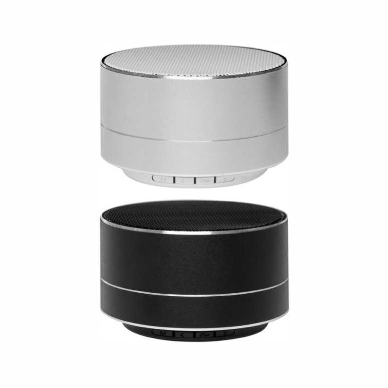 Metal. Ø 7 x 4 cm. Parlante bluetooth. Botones de volumen, encendido, Modo Bluetooth y TF card. En la base detalles antideslizantes. Alcance de transmisión hasta 10 mts. Voltaje DC 5V. Incluye cable USB para carga.