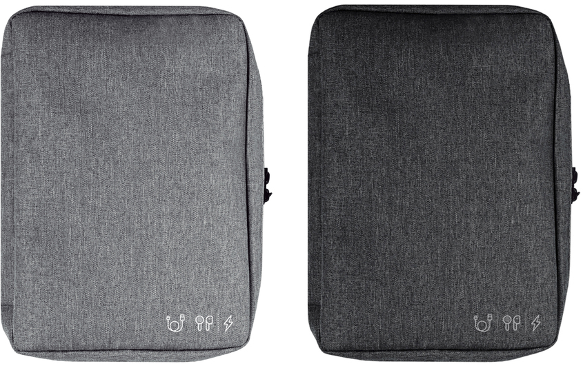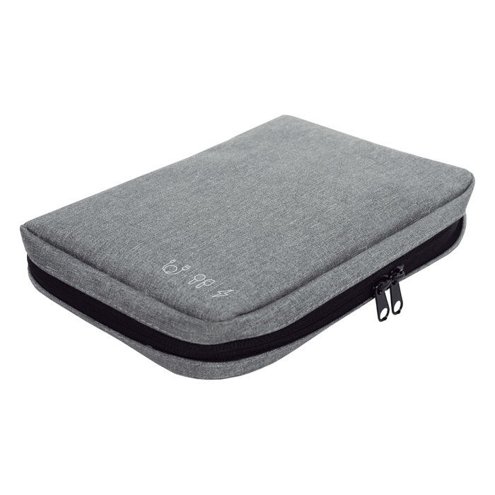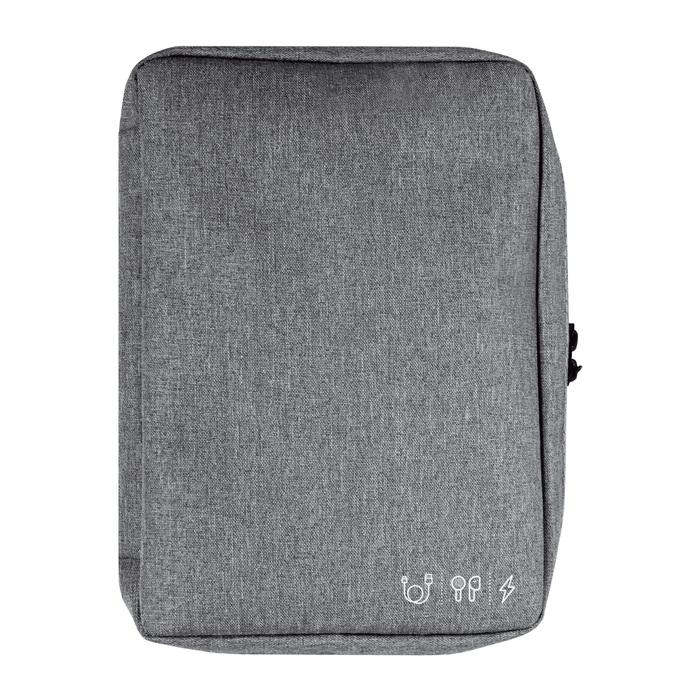 Poliéster. 26 x 19 x 5 cm. Organizador para cables y accesorios. Cuenta con dos bolsillos de red con cierre. 4 elásticos que permiten enrollar y guardar los cables, 1 elástico porta bolígrafo y 2 elásticos amplios. NO INCLUYE ACCESORIOS.