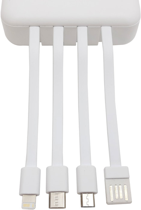8,8 x 7,9 x 2,6 cm. Plástico ABS acabado mate. Powerbank multipuerto. Pantalla digital. Doble salida USB. Entradas micro-USB y USB tipo C. Salida de carga rápida 2A. Linterna dual led. 4 cables de carga integrados: USB, Micro USB, Tipo C y IPhone. Capacidad: 5000 mAh. Puede cargar hasta 5 dispositivos al tiempo. Presentación en caja de regalo.
