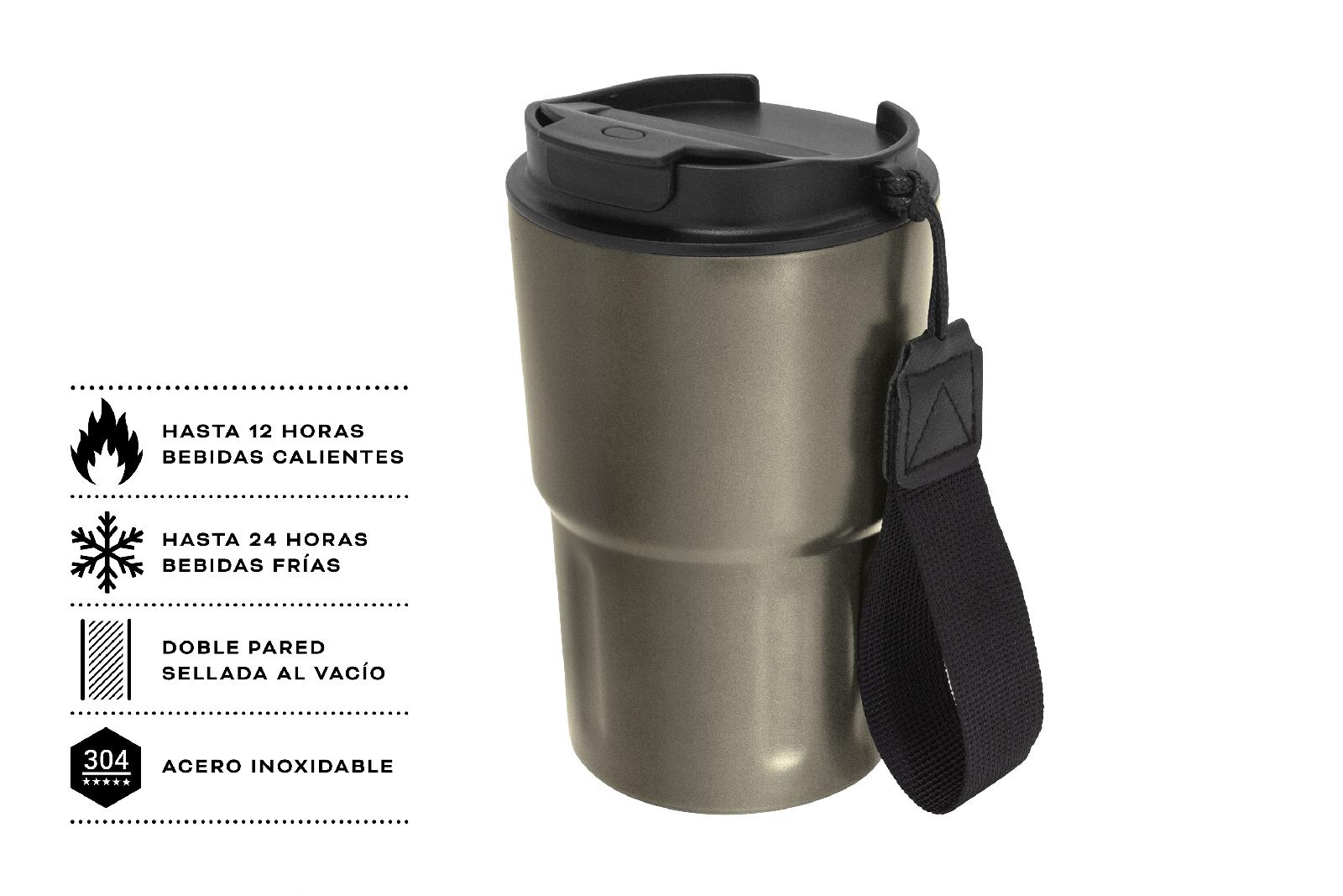 Disfruta cada sorbo, donde sea.Mug doble pared, sellado al vacío. Interior en acero 304 y exterior en acero 201. Tapa de polipropileno con anillo de silicona y correa de poliéster en color negro. Pintura acabado mate. Mantiene por más de 12 hs la temperatura de las bebidas calientes y 24 hs de las bebidas frías.Medidas: Ø 8,8 cm x 14,5 cm. Capacidad: 400 ml. Materiales: Acero inoxidable y polipropileno. Presentación: en caja de regalo Kraft.