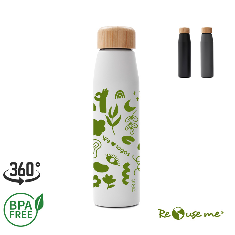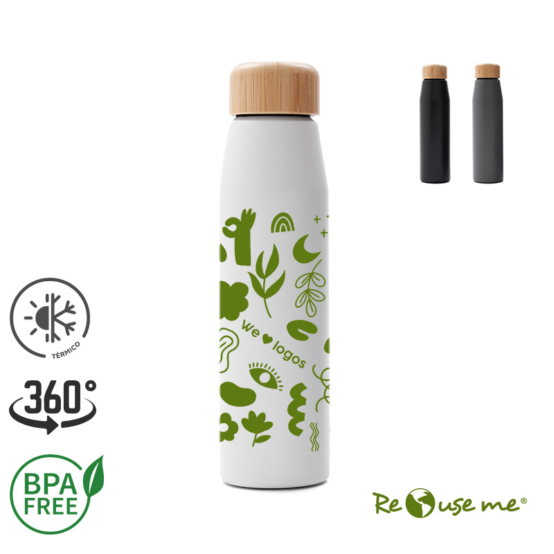 Botella de 500ml fabricada en doble pared de acero inoxidable con tapa a rosca de bamboo. Ideal para el día a día o actividades deportivas. Mantiene las bebidas frías por 8 horas y calientes durante 4 horas. Con impacto positivo en el medio ambiente, esta botella reutilizable te ayuda a reducir el consumo de plástico de un solo uso. Producto libre de BPA, aprobado por el I.N.A.L. para el contacto con alimentos. No es apto para lavavajillas. No es apto para microondas. ReUseMe.